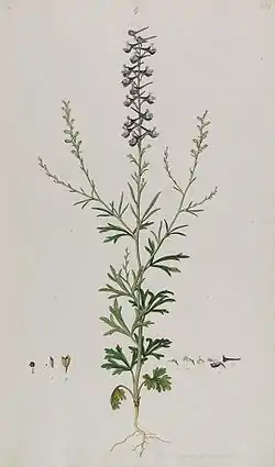Tiene tallos erectos (15-) 30 a 80 cm, pruinosos, todo pubescentes o solo en la base, con escamas ascendentes. Hojas 1 (-2) palmatisectas, con lineaduras lanceoladas; las superiores enteras. Flores violeta intensa o violeta azulino. El perianto (4 pétalos) mínimamente pubescentes por fuera, uno lateral de 7 a 10 mm, más corto que el espolón. Los sépalos más largos que el perianto; es 3 a 6 veces más largo que ancho. Los frutos tienenmuchas semillas pubescentes.