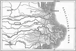 Hace un millón de años, la zona entre las dos ramas extremas de la bifurcación que presenta el río, estaba enteramente bajo las aguas. Esta zona debía extenderse bastante más allá de estos límites; al norte hasta el río Adigio que no es más que una veintena de kilómetros y, al sur por el río Reno que desciende de los Apeninos en dirección a Bolonia, por los tres ríos Lamone, Montone y Ronco que crean los pantanos de Rávena, luego por el río Savio y las salinas de Cervia que se extendían hasta Cesenatico y el Rubicón.