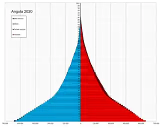 Al año 2021, Angola tiene una población de 34.503.774 habitantes.[1] La esperanza de vida es de 61,49 años.[2] Angola posee seis grupos étnicos bien definidos, de punto de vista lingüístico, hablantes todos de la lengua bantú: ovimbundu 37%, kimbundu 25%, bakongo 13%, Tucokwe 13%, Vangangela 9%, Vanyaneka 5%. Cuando se considera el punto de vista del número de hablantes, es la lengua Umbundu que sobresale.