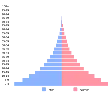 - 0-14 años: 43.7% (hombres 2,706,276/mujeres 2,654,338)