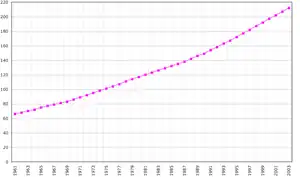 ![]() Evolución de la población de Vanuatu entre 1961 y 2003. Datos de la FAO, 2005. En miles de habitantes. | ||