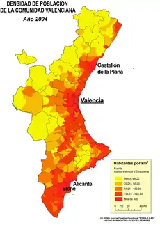 La Comunidad Valenciana, es con 5 058 138 habitantes (INE 2021),[1] la cuarta comunidad autónoma de España por población, y representa el 10,7% de la población nacional. Su población se encuentra muy desigualmente distribuida, estando concentrada en la franja costera y presentando una densidad de población media de 215,2 hab./km². La región presenta un fuerte crecimiento demográfico desde los años 1960; el 13,5% de su población es de nacionalidad extranjera (INE 2016).