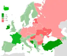 Sobre la tasa de crecimiento natural de la población debe anotarse que la tasa de natalidad de casi todos los países de la Unión está creciendo,[12] con excepción de Alemania, Italia, Grecia y Suecia. Las tasas más altas de natalidad se observan en Irlanda (16,1 nacidos por mil habitantes),[13] Francia (12,29)[14] y Países Bajos (10,2).[15] En el otro extremo aparecen Alemania (8,3)[16] y Grecia (9,1).[17]