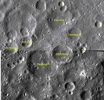 Por convención estos elementos son identificados en los mapas lunares poniendo la letra en el lado del punto medio del cráter que está más cerca de Denning.