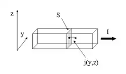 Matemáticamente, la corriente y la densidad de corriente se relacionan como: