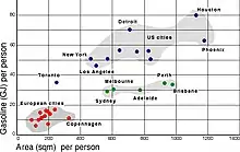 Se suele afirmar que las ciudades de mayor densidad son más sostenibles que las ciudades de baja densidad. Gran parte de la teoría de la planificación urbana, particularmente en América del Norte, el Reino Unido, Australia y Nueva Zelanda, se ha desarrollado con el objetivo de elevar las densidades urbanas, como el Nuevo urbanismo, el desarrollo orientado al Tránsito y el crecimiento inteligente. Sin embargo, el vínculo entre la densidad urbana y los aspectos de sostenibilidad sigue siendo un área disputada de la teoría de la planificación.[1] Jan Gehl, destacado diseñador urbano y experto en urbanismo sostenible, argumenta que las ciudades dispersas y de baja densidad son insostenibles ya que dependen del automóvil. Una minoría, como Randy O'Toole del Libertarian Cato Institute, responde que el aumento de las densidades se traduce en bienes raíces más caros, mayor congestión vial y más contaminación del aire localizada. Otros responden que la congestión del tráfico no es resultado de la densidad de población sino de la capacidad de estacionamiento.[2] A un nivel más amplio, existe evidencia que indica una fuerte correlación negativa entre el consumo total de energía de una ciudad y su densidad urbana general, es decir, a menor densidad, más energía se consume.[3]