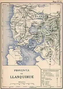 - En 1894 el gobierno declaró, mediante decreto, que el territorio comprendido entre los paralelos 42° S y 47° S, y que no hubiera sido asignado por disposiciones anteriores a la provincia de Chiloé, formaba parte del departamento de Llanquihue.[5] Es decir, desde el límite sur del departamento de Quinchao hasta el límite con el Territorio de Magallanes.