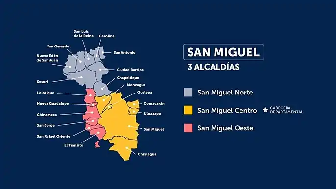 San Miguel es un departamento de El Salvador. Su cabecera departamental es San Miguel, ciudad que se encuentra a 138 km de San Salvador. Limita al norte con la República de Honduras; al este con los departamentos de Morazán y La Unión; al oeste con los departamentos de Cabañas y Usulután; y al sur con el océano Pacífico. Cubre un área de 2.077,1 km² y en 2023 tiene una población de 693,562 habitantes. Fue declarado departamento el 12 de junio de 1824. Originalmente, el departamento de San Miguel, abarcaba todo el territorio que hoy forma la Zona Oriental de El Salvador, teniendo como frontera oeste al río Lempa; al norte y este limitaba con Honduras; al sureste con el Golfo de Fonseca; y por el sur limitaba con el océano Pacífico. Pero a finales del siglo XIX San Salvador dividió el territorio en los actuales cuatro departamentos con el objetivo de limitar la influencia de la ciudad de San Miguel en los intereses nacionales. Ciertamente, los decretos de creación de los departamentos orientales dejan explicitado ese hecho.[2]