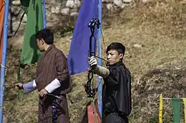 El tiro con arco es el deporte nacional y más popular en Bután[1] y está organizado dentro de la Federación de Tiro con Arco.[7] El tiro con arco tradicional de Bután se diferencia de los estándares olímpicos en detalles técnicos como la ubicación de los objetivos; la distancia a la diana es de unos 130 metros.[8] Los objetivos (llamados karay),[9] relativamente pequeños, son de madera pintada con pigmentos brillantes, y por lo general miden alrededor de 91 cm de alto y 28 cm de ancho.[4] Tradicionalmente, los arcos butaneses son de bambú; las flechas suelen ser de este material o de caña y presentan remates de plumas. El carcaj puede ser de madera, con una cubierta de piel de animal y una correa tejida.[4][8]