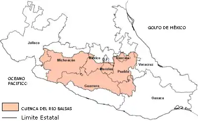 La cuenca del río Balsas o Depresión del Balsas comprende el 6 por ciento de la masa continental del territorio mexicano y abarca porciones de varias regiones económicas del Pacífico centro-occidente y centro-sur de la República, entre los paralelos 17° 00' y 20° 00' de latitud Norte y los meridianos 97° 30' y 103° 15' de longitud Oeste de Greenwich, a través de ocho estados de la república: Morelos (100%) la totalidad de este estado con sus 36 municipios está inmerso en la Depresión del Balsas, Puebla (55%), Estado de México (36%), Guerrero (63%), Michoacán (62%).