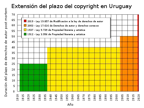 En diciembre de 2019 se aprobó una nueva extensión de los plazos de derecho de autor y derechos conexos. A través de la ley 19.857, se elevó el plazo de derecho de autor a 70 años después de la muerte de los autores, mientras que los plazos de los derechos de intérpretes, ejecutantes, productores de fonogramas y organismos de radiodifusión, se elevaron a 70 años desde la publicación. La medida, apoyada por la Asociación General de Autores del Uruguay, recibió fuertes críticas de la Asociación de Bibliotecólogos del Uruguay y de otras organizaciones vinculadas al acceso al conocimiento. En la misma sesión legislativa en que se aprobó la elevación de los plazos, también se sancionó otra ley que otorgó nuevos derechos exclusivos, de carácter irrenunciable, a los directores y guionistas de obras audiovisuales.