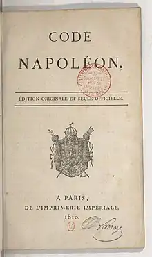 El Código Civil Francés, conocido como el Código Napoleónico o Código de Napoleón, es uno de los más conocidos códigos civiles del mundo. Fue aprobado por la Ley del 21 de marzo de 1804 y se encuentra todavía en vigor, aunque con numerosas e importantes reformas. Fue promulgado como Code Civil des Français en 1804[15] durante la República bajo el gobierno de Napoleón Bonaparte. Fue elaborado por una comisión creada para recopilar la tradición jurídica francesa. El Código Civil francés retoma numerosas disposiciones del Código de Justiniano por influencia de Robert Joseph Pothier, y también retoma numerosas disposiciones de las costumbres de París. En cuanto a las propiedades, clasifica, por ejemplo, los bienes en muebles e inmuebles siguiendo al derecho romano.