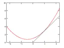 Para hallar la pendiente de la recta tangente a la función en y paralela al plano , tratamos como una constante. La gráfica y este plano se muestran a la derecha. Abajo, véase el aspecto de la función en el plano . Hallando la derivada de la ecuación suponiendo que es una constante, encontramos que la pendiente de en el punto es: