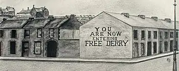 El nombre Free Derry se tomó de la pintada (que aún sobrevive, convertida en un monumento del nacionalismo irlandés) en un muro en la esquina de las calles Lecky y Fahan.[11]