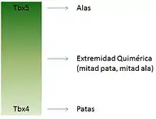 La especificación de las extremidades anterior y posterior durante el desarrollo del embrión de pollo está mediada por dos genes que codifican para factores de transcripción y que pertenecen a la familia de genes de la caja T (T-box en inglés). Estos genes son Tbx4 y Tbx5 y se expresan en las extremidades posteriores y anteriores respectivamente. Este patrón de expresión se observa también en las extremidades de los ratones según observaciones hechas por Gibson y Brown en 1996. A través de una serie de experimentos encaminados a conocer cómo actúan estos factores de transcripción en los cuales se inducía la aparición de una extremidad ectópica (usando FGF) entre los primordios de las extremidades anteriores y posteriores, fue posible determinar que los genes Tbx4 y Tbx5 no solo determinan que tipo de extremidad se forma cuando se expresan de forma ectópica sino también intervienen en la actividad de otros factores asociados al desarrollo de las extremidades como WNT, BMP y FGF; y que a su vez, BMP y FGF regulan la transcripción de los genes Tbx.[9]