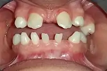 Anodoncia es la ausencia del total de dientes. La hipodoncia es la ausencia de hasta 6 elementos dentarios mientras que la oligodoncia es la ausencia de más de 6 elementos dentarios.[22][23]