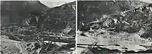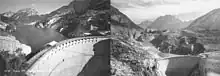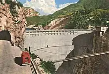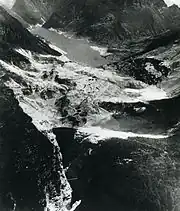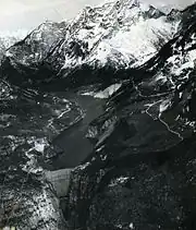 ![]() La presa de Vajont, vista desde el pueblo de Longarone en 2005, muestra aproximadamente los 60-70 metros superiores de hormigón. El muro de agua que superó la presa en 250 metros y destruyó esta aldea y todas las aldeas cercanas el 9 de octubre de 1963 habría oscurecido prácticamente todo el cielo azul en esta foto. | ||
