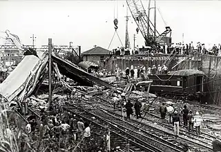La locomotora descarrilada y los dos primeros vagones pasaron el puente. El primer vagón, que se soltó de los demás, se abrió al chocar con un mástil cortado al lado de la vía, matando a ocho pasajeros. Los vagones restantes se detuvieron y el segundo vagón salió del puente. La mitad trasera del tercer vagón y la mitad delantera del cuarto vagón quedaron bajo el puente debilitado, cuyo peso se estimó en 570 toneladas (570 000 kg).[4] En cuestión de segundos, con todos sus soportes derribados, el puente y varios automóviles que se encontraban encima se derrumbaron sobre los vagones, aplastándolos a ellos y a los pasajeros que se encontraban en su interior.[5]