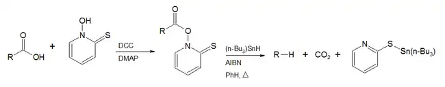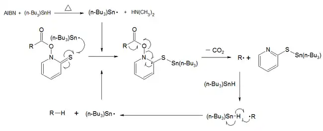 La reacción es iniciada por la ruptura homolítica del iniciador de radicales, en este caso el 2,2'-azobisisobutironitrilo (AIBN), aplicando calor. A continuación, el hidrógeno es abstraído de hidruro de tri-n-butilestaño para obtener un radical libre de tri-n-butilestaño que ataca al átomo de azufre del éster de Barton. El enlace nitrógeno-oxígeno del éster hidroxámico es escindido para formar dióxido de carbono, el 2-piridinilsulfuro de tributilestaño y un radical libre de alquilo. El radical alquilo (R·), abstrae un átomo de hidrógeno a partir del hidruro de tri-n-butilestaño para formar el alcano reducido (HR). (Véase el esquema 2) El radical tributilestaño entra en otro ciclo de la reacción hasta que todos los ésteres de Barton se consumen. La ruptura del enlace nitrógeno-oxígeno del éster de Barton también puede ocurrir espontáneamente por calentamiento o por irradiación con luz para iniciar la reacción. También es posible enlazar funciones orgánicas al radical alquilo por el uso de otras especies formadas de la ruptura (XY + R· → RX + Y·)[5] La reacción se produce debido a la formación del enlace estable de estaño-azufre (S-Sn) y por la aromatización del anillo de quinolina. También hay un aumento general de entropía debido a la formación de los 3 productos a partir de dos sustratos que dirige la reacción hacia la derecha.