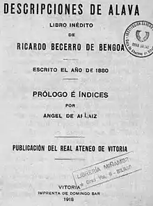 Aunque los textos de Descripciones de Álava fueron escritos por Ricardo Becerro de Bengoa (1845-1902) en torno a 1880,[lower-alpha 1] la obra no se publicó hasta 1918, año en que salió de la vitoriana imprenta regentada por Domingo Sar por impulso del Real Ateneo Científico, Literario y Artístico de Vitoria.[1][2] Por aquel entonces, el autor llevaba ya más de tres lustros fallecido.[2] «Las Descripciones de Alava, lo son de una serie de excursiones que abarcan todo su territorio, y que Becerro realiza antes y después de la Guerra civil del 72 al 76; pero todas las de que constan en el texto las fechas, á partir del año 1870 en que consiguió por oposición en el Instituto de Palencia una cátedra, practicando su amor al suelo nativo durante las vacaciones», explicaba en el prólogo Ángel de Apraiz y Buesa.[4] Se describen en más de tres centenares de páginas desde «la constitución geológica del terreno con los fósiles que en él se encuentran» hasta «las etimologías vascas de los lugares que atraviesa».[5] En los textos ―algunos ya publicados antes en las revistas Euskal-Erria[6] y Ateneo―,[1] visita lugares como Salvatierra, Aramayona, Zuya, Santa Cruz de Campezo, Treviño, Peñacerrada, Sobrón, Valdegovía y Salinas de Añana, entre otros muchos.[7] En 1996, se publicó una segunda edición de la obra a cargo de la editorial Papeles de Zabalanda.[2]