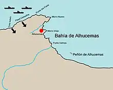 El desembarco de Alhucemas fue un desembarco militar llevado a cabo el 8 de septiembre de 1925 en Alhucemas por el Ejército y la Armada españolas y, en menor medida, un contingente aliado francés, que propiciaría el fin de la guerra del Rif. Se considera el primer desembarco anfibio en la historia que involucra el uso de tanques y apoyo aéreo masivo por mar.[2][3] El desembarco de Alhucemas se cree que es uno de los precursores de los desembarcos anfibios aliados en la Segunda Guerra Mundial,[4] y la primera operación combinada exitosa del siglo XX.[5]