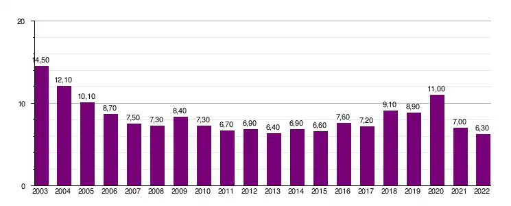 | FMI[45] | 17.3 | 13.6 | 11.6 | 10.2 | 8.5 | 7.9 | 8.7 | 7.8 | 7.2 | 7.2 | 7.1 | 7.3 | 6.5 | 8.5 | 8.4 | 9.2 | 9.8 | 11.6 | 8.8 | 6.8 | - |