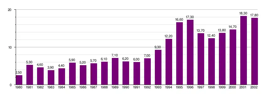 | 1980 | 1981 | 1982 | 1983 | 1984 | 1985 | 1986 | 1987 | 1988 | 1989 | 1990 | 1991 | 1992 | 1993 | 1994 | 1995 | 1996 | 1997 | 1998 | 1999 | 2000 | 2001 | 2002 |