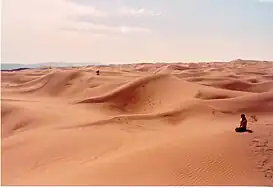 En este gran desierto de arena dorada se levanta una alta duna de decenas de metros de alto que ofrece una característica muy especial: como resultado de algún viento o del movimiento humano, la duna produce una resonancia de sonido similar a una campana .