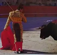 Esta es una actitud desafiante del matador hacia el toro, generalmente al final de la faena. Solo debe realizar al final de la faena, cuando el toro está claramente dominado.[2]