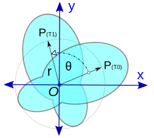 Cuando una partícula viaja del punto P al punto Q en un intervalo de tiempo , como lo hace en la ilustración de la derecha, el radio del círculo pasa por un cambio de ángulo , que es igual a su desplazamiento angular.