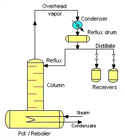 La olla se llena con la mezcla líquida y se calienta. El vapor fluye hacia arriba en la columna rectificadora y se condensa en la parte superior. Normalmente, todo el condensado se devuelve inicialmente a la columna como reflujo. Este contacto de vapor y líquido mejora considerablemente la separación. En general, este paso se denomina inicio. El primer condensado es la cabeza , y contiene componentes indeseables. El último condensado son las fintas y también es indeseable, aunque agrega sabor. En medio está el corazón y esto forma el producto deseado.