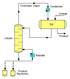 Durante la operación (después de cargar la caldera y poner en marcha el sistema), los componentes de alto punto de ebullición se separan principalmente de la mezcla de carga. El líquido en la caldera se agota en los constituyentes de alto punto de ebullición y se enriquece en los de bajo punto de ebullición. El producto de alto punto de ebullición se enruta a los receptores del producto de abajo. El producto residual de bajo punto de ebullición se retira del recipiente de carga. Este modo de destilación por lotes se aplica muy raramente en procesos industriales.