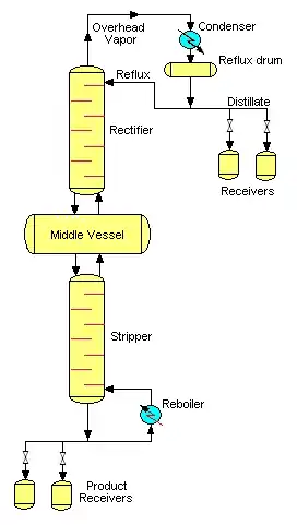 Una tercera configuración de columna de lote factible es la columna de recipiente intermedio. La columna del vaso intermedio consta de una sección de rectificación y de extracción, y el recipiente de carga está ubicado en el centro de la columna.