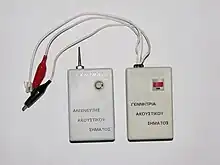- Combinación emisor/receptor vía radio por lo que pueden detectar cables eléctricos ocultos y, según la sensibilidad del receptor pueden permitir captar la radiación o bien sólo cerca de la superficie o la emitida por cables enterrados a cierta profundidad. Al no precisar un contacto con el conductor permiten detectar, a cierta distancia, donde se produce una discontinuidad.