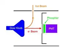 Los iones que golpean el metal liberan un electrón secundario. Un alto voltaje (aprox. -20.000 V) entre el metal y el centelleador acelera los electrones en el propio centelleador, que emite fotones. Los fotones son detectados por el fotomultiplicador.