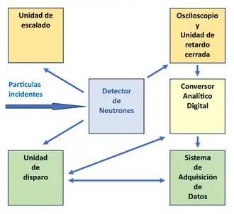 La señal de detección del detector de neutrones está conectada a la unidad escaladora, la unidad de retardo cerrada, la unidad de disparo y el osciloscopio. La unidad escaladora se utiliza simplemente para contar el número de partículas o eventos entrantes. Lo hace incrementando su recuento de partículas cada vez que detecta un aumento en la señal del detector desde el punto cero. Hay muy poco tiempo muerto en esta unidad, lo que implica que no importa qué tan rápido entren las partículas, es muy poco probable que esta unidad no cuente un evento (por ejemplo, una partícula entrante). El bajo tiempo muerto se debe a la electrónica sofisticada de esta unidad, que tarda poco en recuperarse de la tarea relativamente fácil de registrar un nivel lógico alto cada vez que ocurre un evento. La unidad de activación coordina todos los componentes electrónicos del sistema y proporciona una señal lógica a estas unidades cuando toda la configuración está lista para registrar la presencia de un evento.