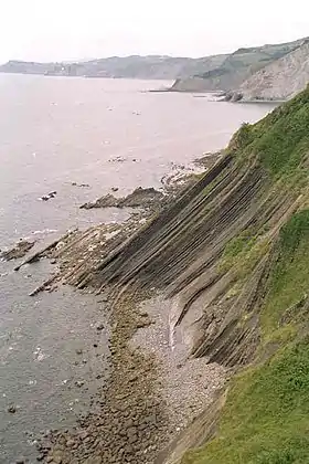 La costa destaca por los grandes acantilados de más de 150m de altura, a cuyos pies se abre la rasa mareal, con playas salvajes de rocas y piedras. Los flyschs se muestran en toda su claridad y se ve cómo los "emparedados" de diferentes rocas entran, rotos, en el mar.