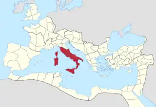 En el año 297 se dividió la Dioecesis Italiae en dos partes: «Italia Suburbicaria» —que agrupaba las provincias del sur— e «Italia Annonaria» —que lo hacía con las del norte—.[4] Ambas, junto a las de Hispania y África, se asignaron a Maximiano. En el año 303, este abdicó junto a Diocleciano de su puesto de augusto y el territorio de Italia fue asignado a Severo. Al poco tiempo cayó bajo el control de Majencio quien fue derrotado por Constantino tras una guerra civil. A la muerte de este, el Imperio se dividió entre sus hijos y Constante recibió las diócesis italianas, las ilíricas y África.[5]