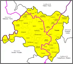 El territorio se extiende sobre unos 1234 km² y se divide en 98 parroquias agrupadas en 4 vicariatos foráneos: Agnone, Carovilli, Frosolone y Trivento.[1]