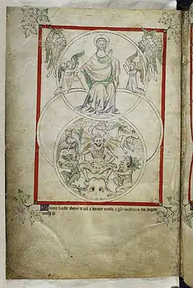 El Libro del Apocalipsis describe una batalla en el cielo (Apocalipsis 12:7-10)[66] entre un dragón/serpiente "llamado diablo o Satanás" y el arcángel Miguel resultando en la caída del dragón. Aquí, el diablo se describe con características similares a monstruos del caos primordial , como el Leviatán del Antiguo Testamento.[53] La identificación de esta serpiente como Satanás apoya la identificación de la serpiente del Génesis con el diablo.[67] Tomás de Aquino, Ruperto de Deutz y Gregorio Magno (entre otros) interpretaron que esta batalla tuvo lugar después de que el diablo pecara al aspirar a ser independiente de Dios. En consecuencia, Satanás y los ángeles malos son arrojados del cielo por los ángeles buenos bajo el liderazgo de Miguel.[68]