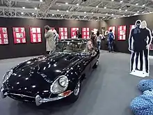 El Jaguar E-Type de Diabolik en la edición del 2015 de la feria romana de historieta Romics; en el lado de la derecha, parecida a un recortable, se ve la pareja formada por Diabolik y Eva Kant.