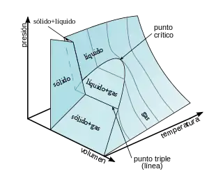 Las superficies delimitan las zonas de existencia de la fase sólida, la fase líquida y la fase gaseosa.