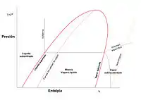 - Una curva de saturación con forma de “U” invertida la cual determina si el compuesto se encuentra en estado de: líquido subenfriado, líquido saturado, mezcla líquido-vapor, vapor saturado o vapor sobrecalentado (color rojo).