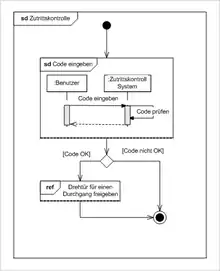El flujo de control entre estas dos interacciones es modelada con elementos de los diagramas de actividades. El proceso comienza en un nodo inicial y finaliza en un nodo terminal para actividades. Un nodo de ramificación entre las interacciones embebidas (el diagrama de secuencia y el de interacción) modela la decisión de si la entrada se abre o si debe permanecer cerrada.