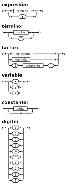 La representación de una gramática que se haga de un conjunto de diagramas de sintaxis. Cada diagrama define un no terminal. Hay un diagrama principal que define el idioma de la siguiente manera: para pertenecer a la lengua, una palabra debe describir una trayectoria en el diagrama principal.