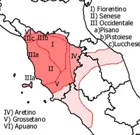 El dialecto toscano es un conforma un conjunto compuesto de muchos dialectos locales menores, con pequeñas diferencias entre ellos. La mayor subdivisión es entre los dialectos toscanos septentrionales y los dialectos toscanos meridionales.