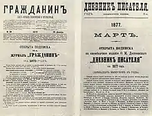 Diario de un escritor (en ruso, Дневник писателя) se compone de artículos y notas que Fiódor Dostoyevski publicó en el semanario conservador Grazhdanín (El ciudadano) en 1873 y 1874, y desde entonces por suscripción popular hasta 1881. El diario era propiedad del príncipe Vladímir Meshcherski y tenía el apoyo de Konstantín Pobedonóstsev, aunque la sección de Dostoyevski adquirió su entidad definitiva a partir de enero de 1876, con la publicación de un folletín de pliego o pliego y medio de imprenta de extensión, y que podía adquirirse mediante suscripción previa al precio de 20 kópeks por número o 2 rublos al año. La gestión de las suscripciones, la contabilidad y los envíos fueron llevados a cabo por Anna Grigórievna, la segunda esposa del escritor.[1]