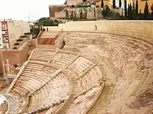 Las diazomatas son claramente visibles como pasillos que separan los diferentes niveles de las gradas en el Teatro romano de Cartagena.