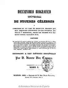- Díez Canseco, Vicente (1844). Diccionario biográfico universal de mujeres célebres I. Madrid: Imprenta de D. José Félix Palacios. Wikidata Q115635731.