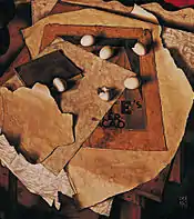 Sus naturalezas muertas meticulosamente compuestas y representadas presentan objetos favoritos como botellas, un cuenco vacío, huevos e instrumentos musicales. Ket yuxtapuso estos objetos en arreglos angulares, vistos desde un alto punto de vista, sus sombras proyectadas crean enfáticas diagonales. Estas composiciones revelan la influencia del cubismo como se filtra a través de los carteles de Cassandre, que se representan con frecuencia en las pinturas de Ket. Otra fuente de inspiración vino de los primitivos flamencos, a los que Ket admiró por su atmósfera de austera reverencia que él llamó su calidad de "intrusismo".[4]